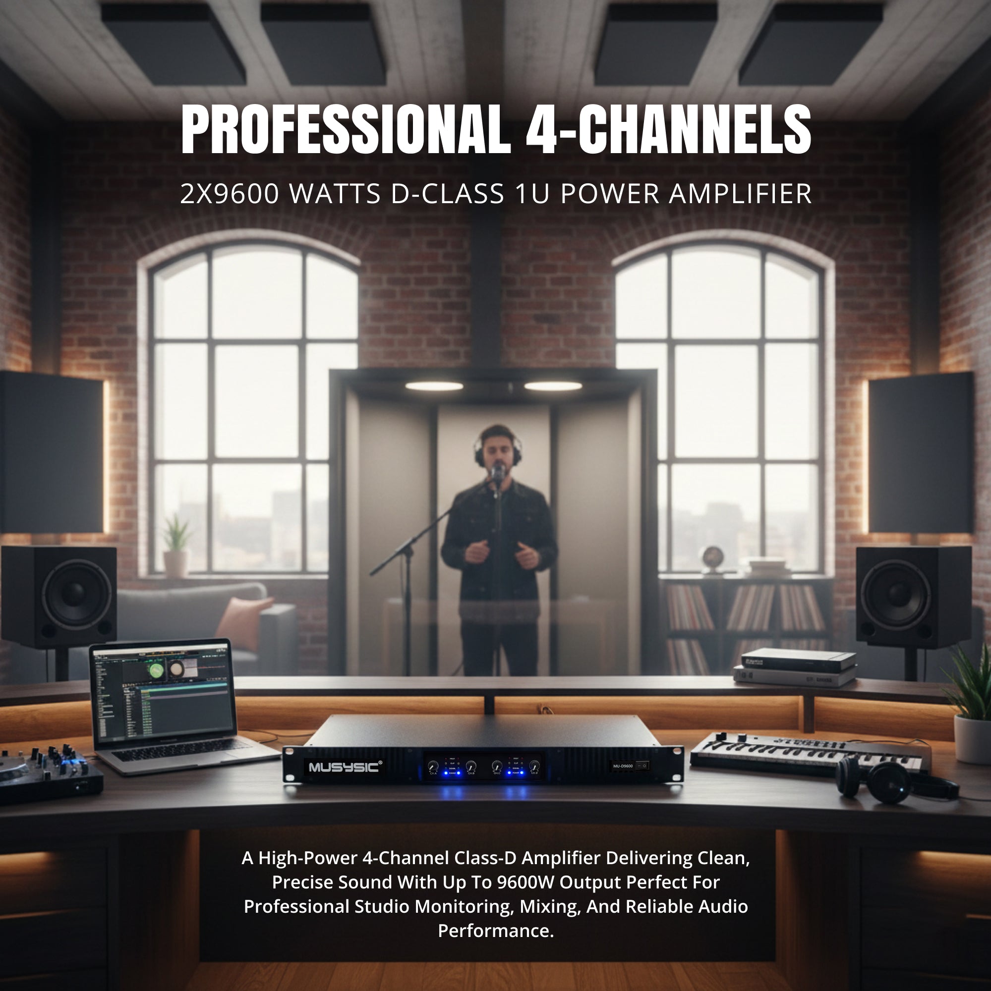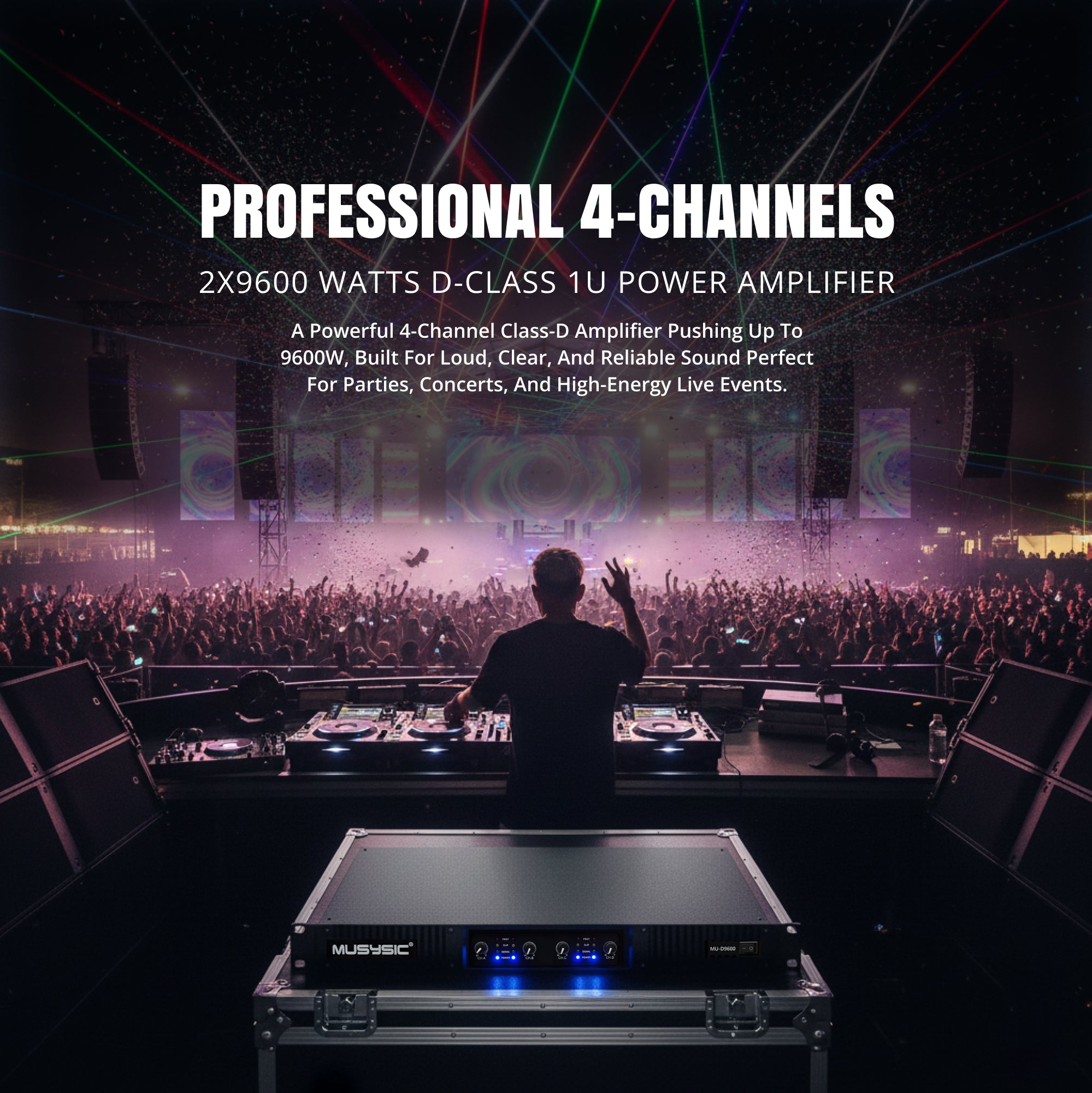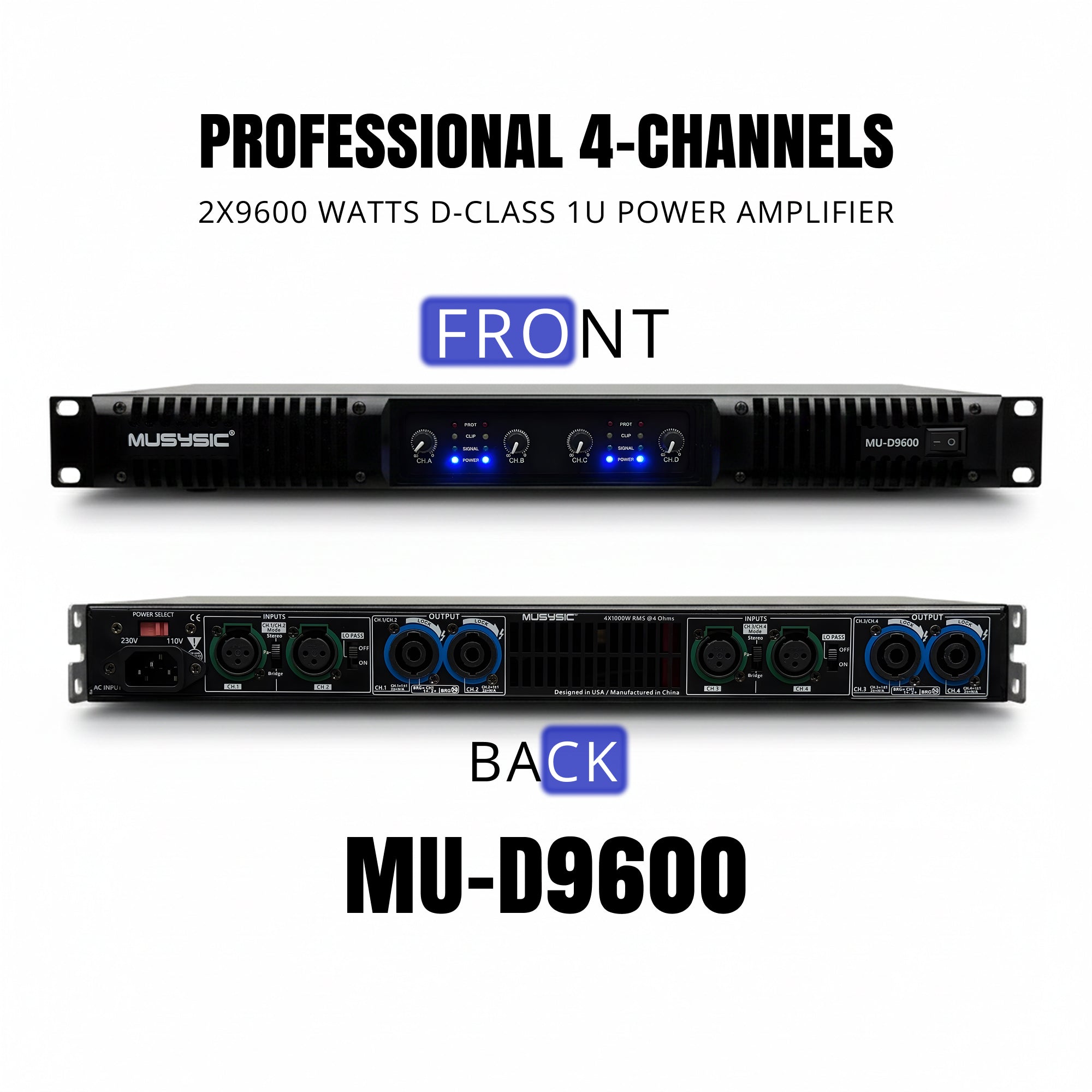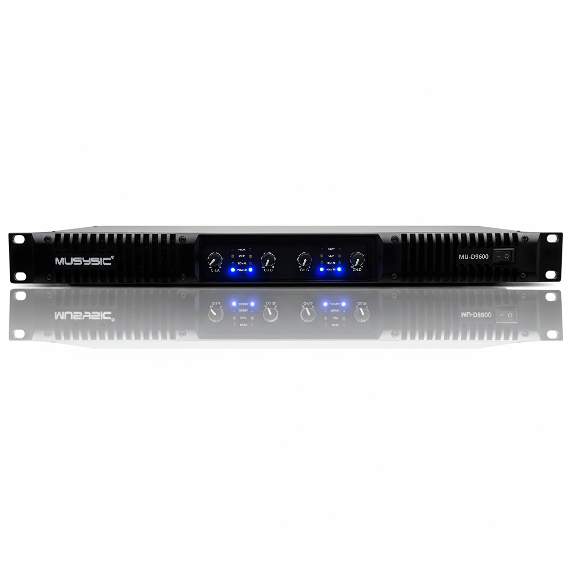 MUSYSIC MU‑D9600 Professional 4‑Channel Power Amplifier – 4×1000W @ 4Ω, LPF, Stereo/Parallel/Bridge Modes, 1U Rackmount